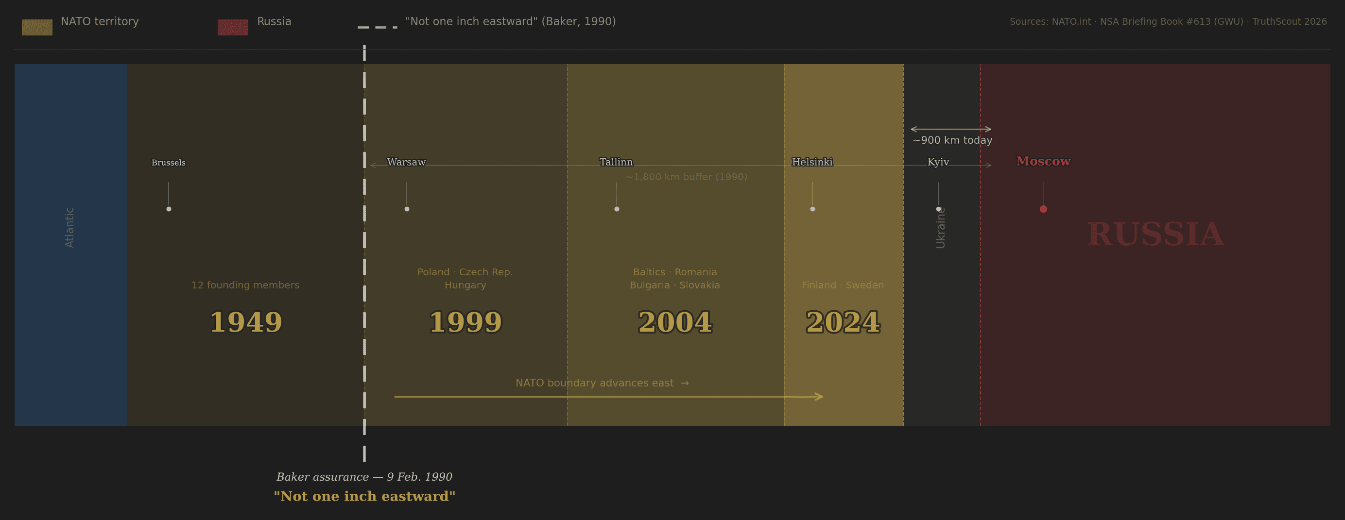 This assurance was not a vague diplomatic pleasantry. It was repeated by Baker, by West German Foreign Minister Hans-Dietrich Genscher, by Chancellor Helmut Kohl, and by British Foreign Secretary Douglas Hurd — all in the weeks surrounding German reunification. The National Security Archive at George Washington University published the relevant declassified documents in December 2017. The primary Baker-Gorbachev memorandum of conversation, confirming the "not one inch" language verbatim, is publicly accessible.